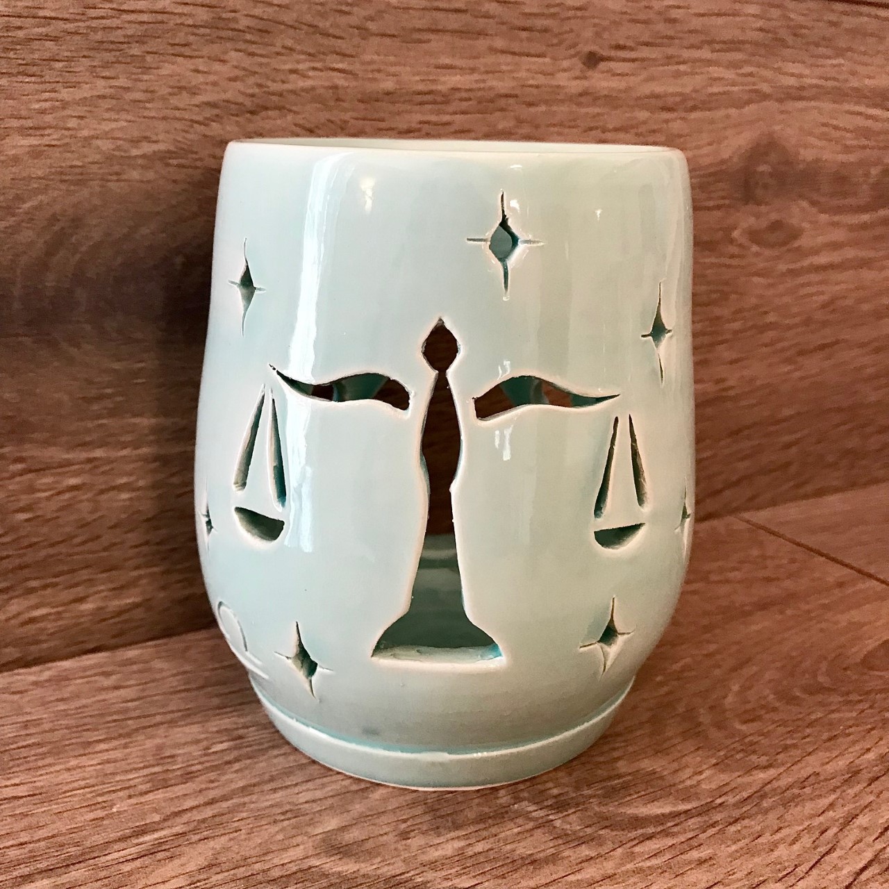 Je vous propose ici cet Astrolumi Balance en faïence émaillée turquoise clair.