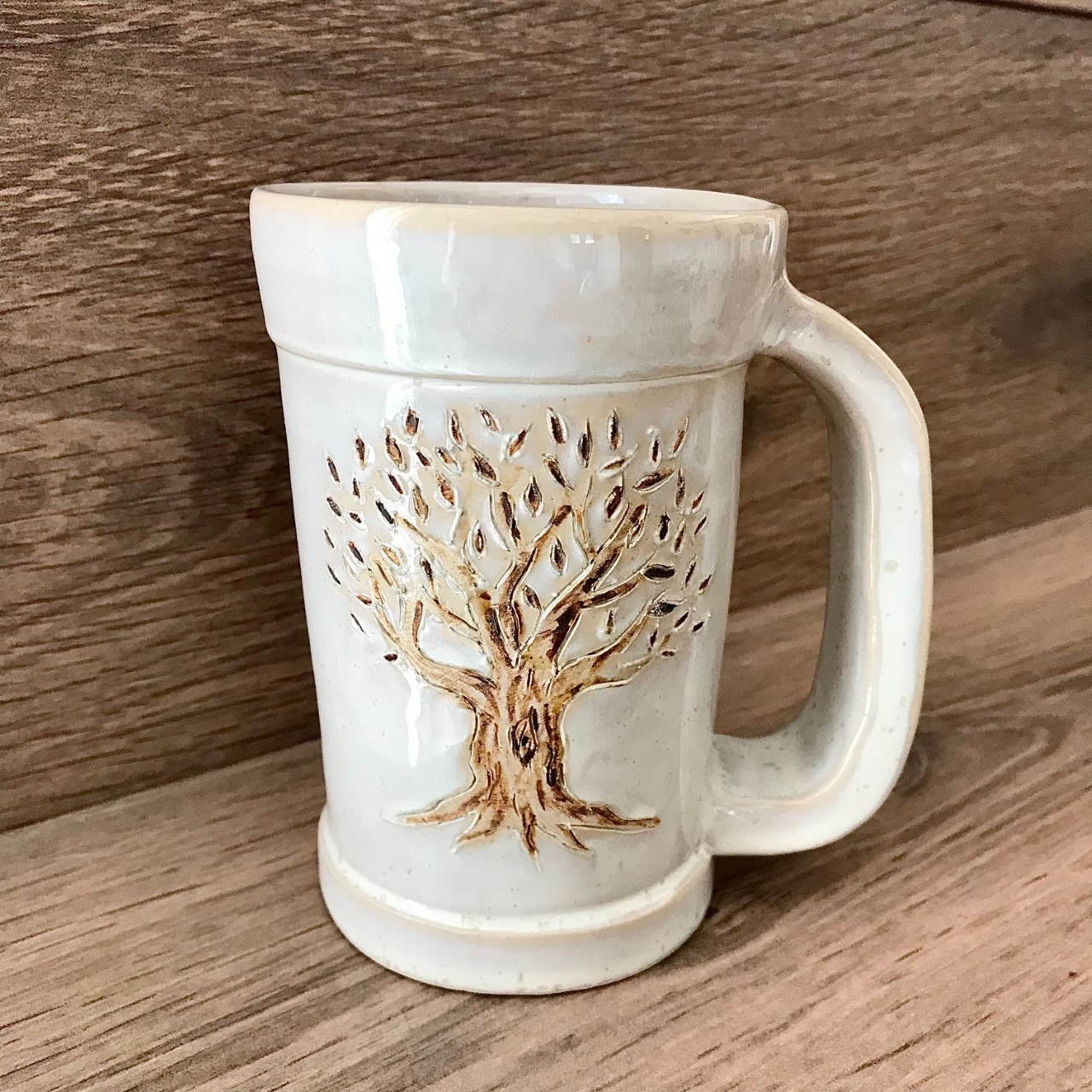 Je vous propose ici une chope en grès émaillé couleur crème décoré d’un arbre.