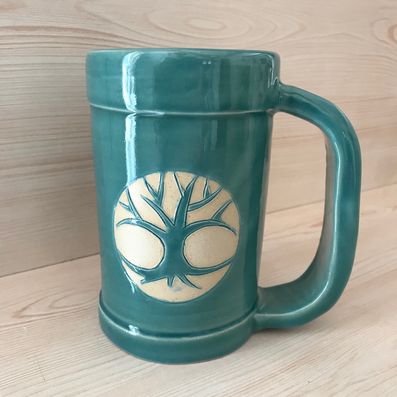 Je vous propose ici une chope en grès émaillé  couleur bleu canard décorée d’un arbre de vie.