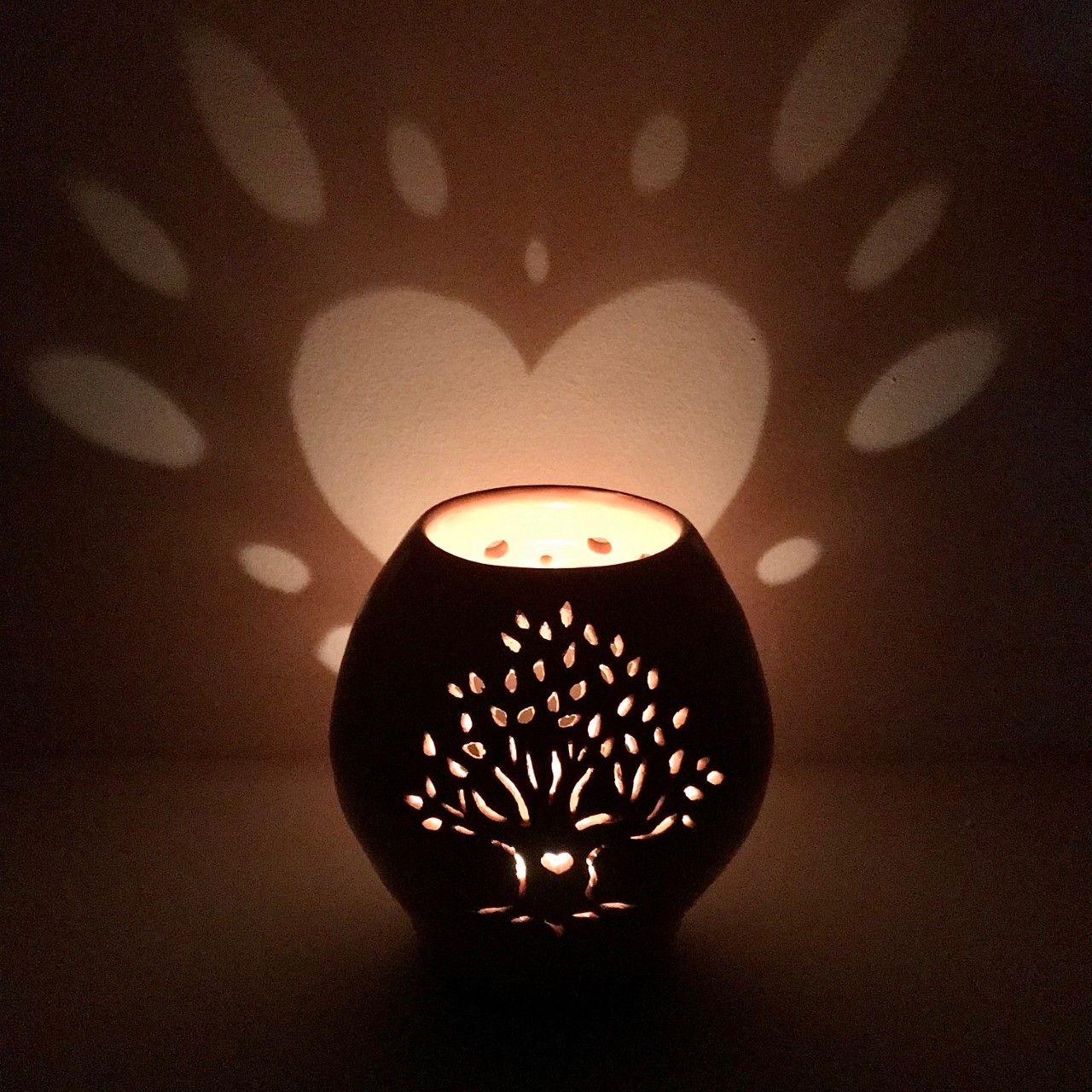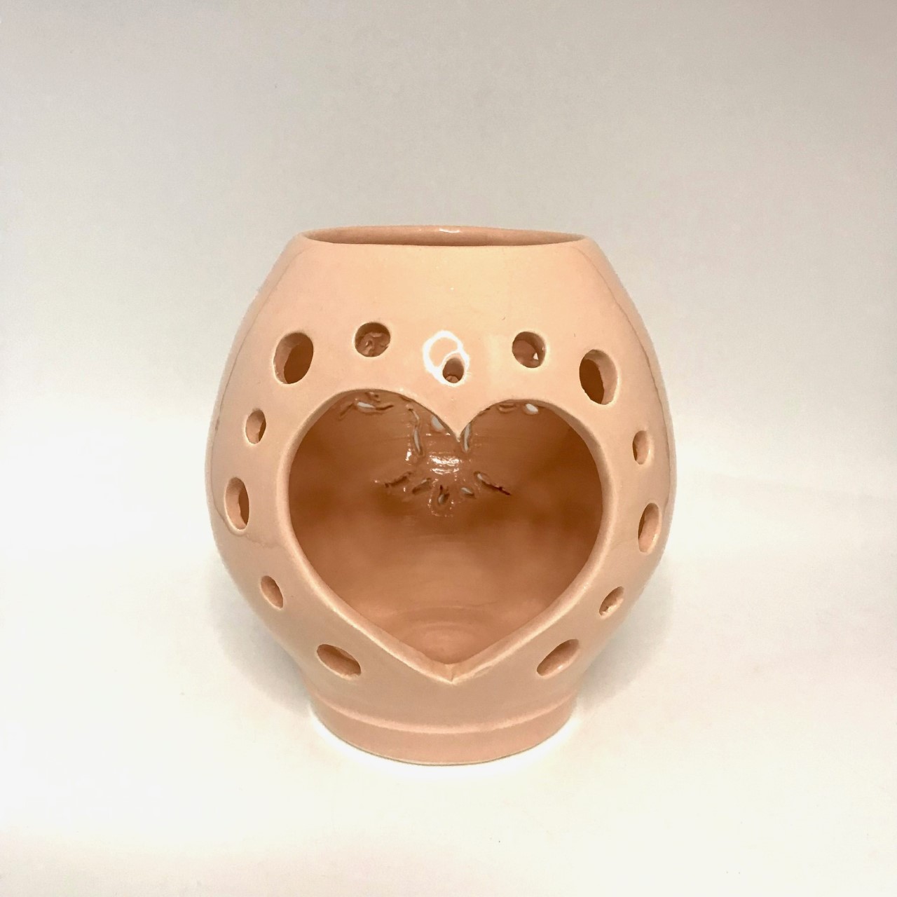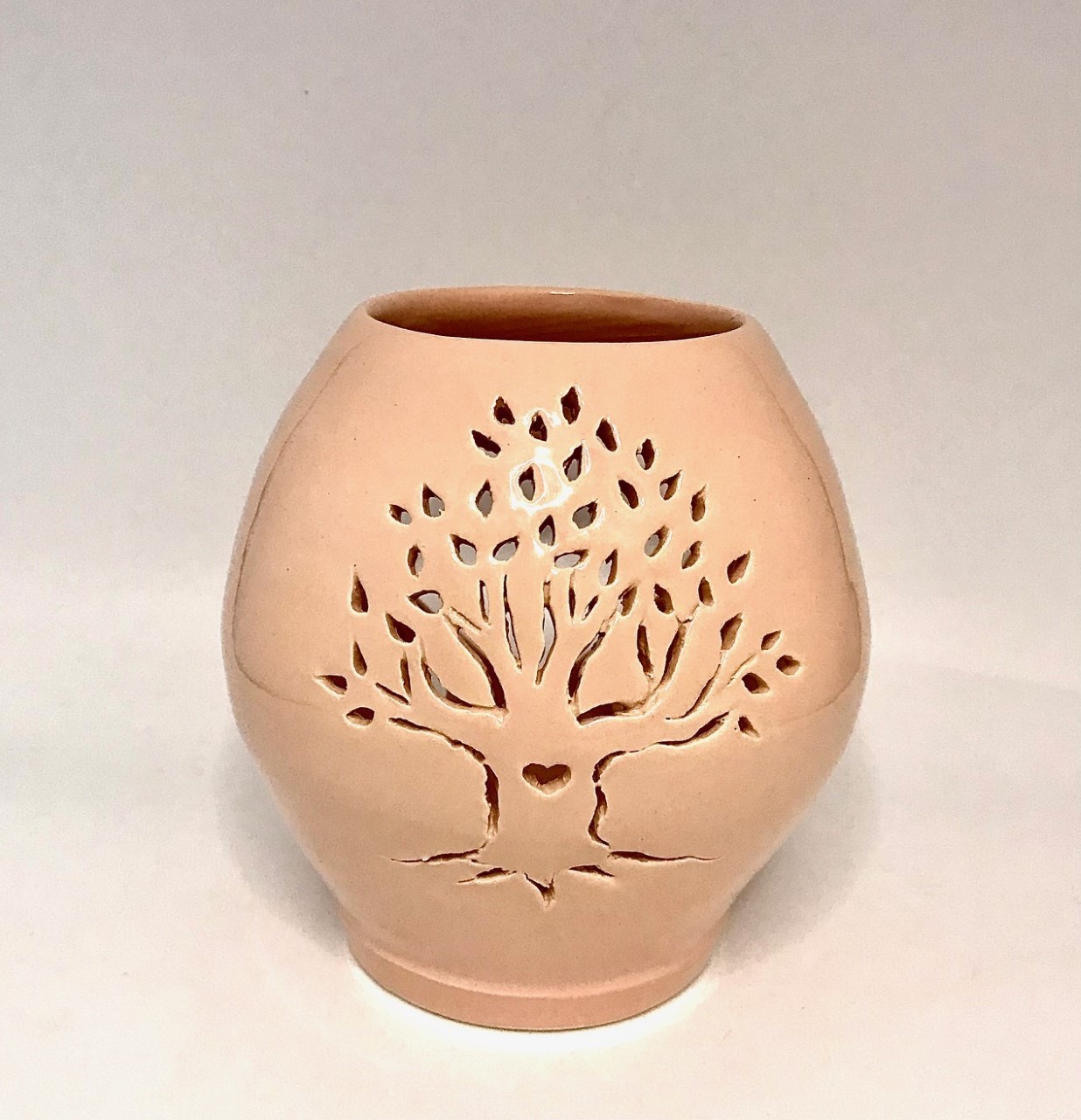 Je vous propose ici un lumilove en faïence émaillée rose saumoné, décoré d’un arbre.