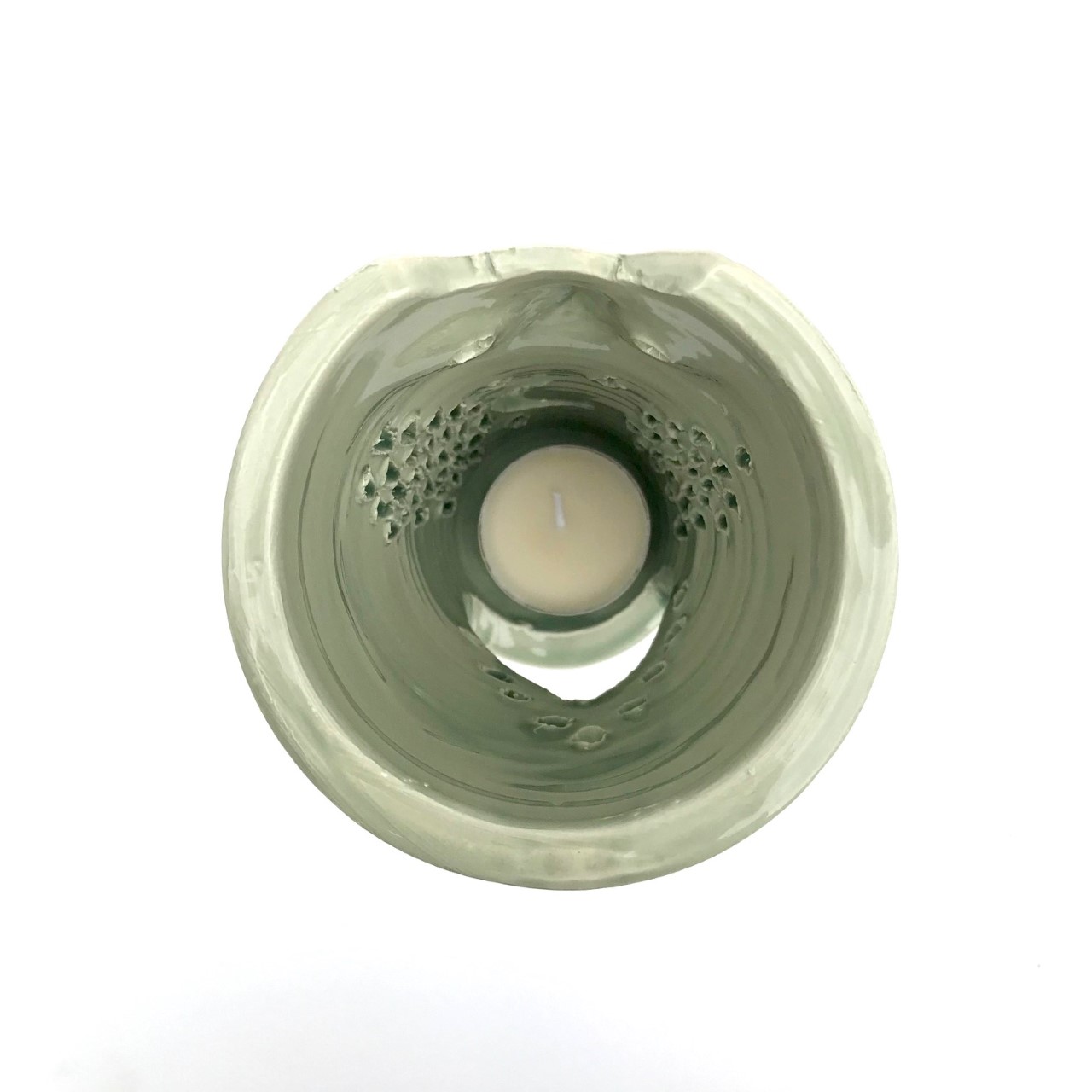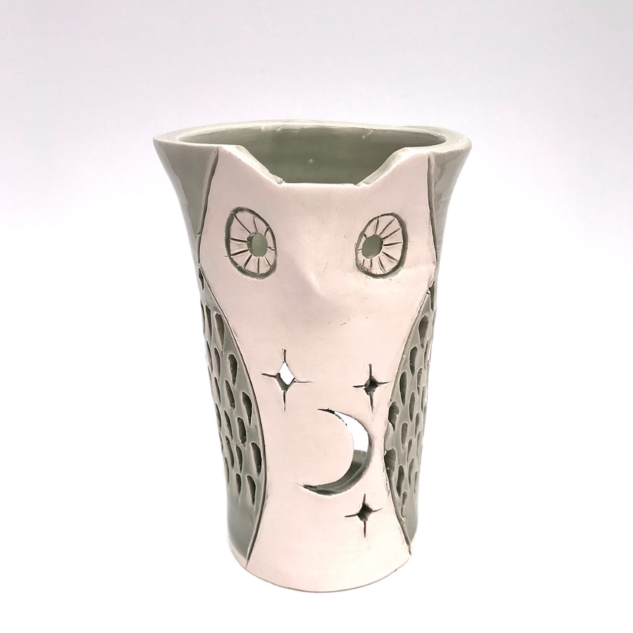 Je vous propose ici un lumilove en faïence émaillée couleur crème et céladon, décoré d’un hibou, oiseau nocturne mystérieux et symbolique. On dit qu’il a la capacité de voir dans l’obscurité, de voir la vérité au delà de la tromperie. Il apporte la sagesse et la connaissance…
