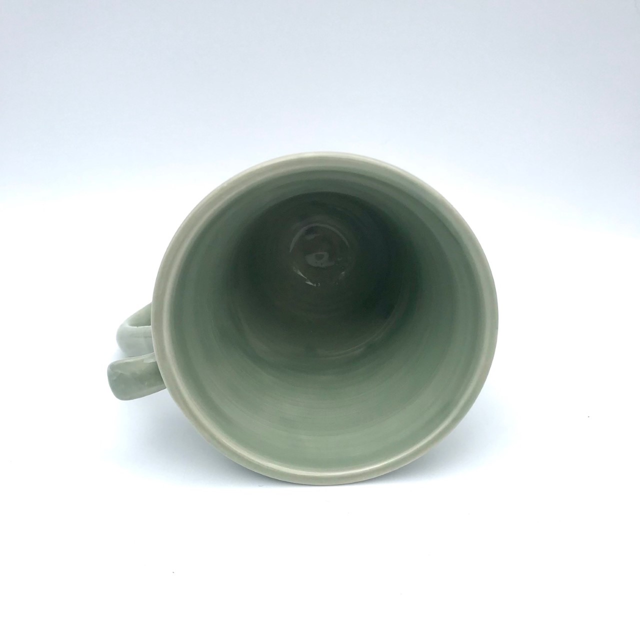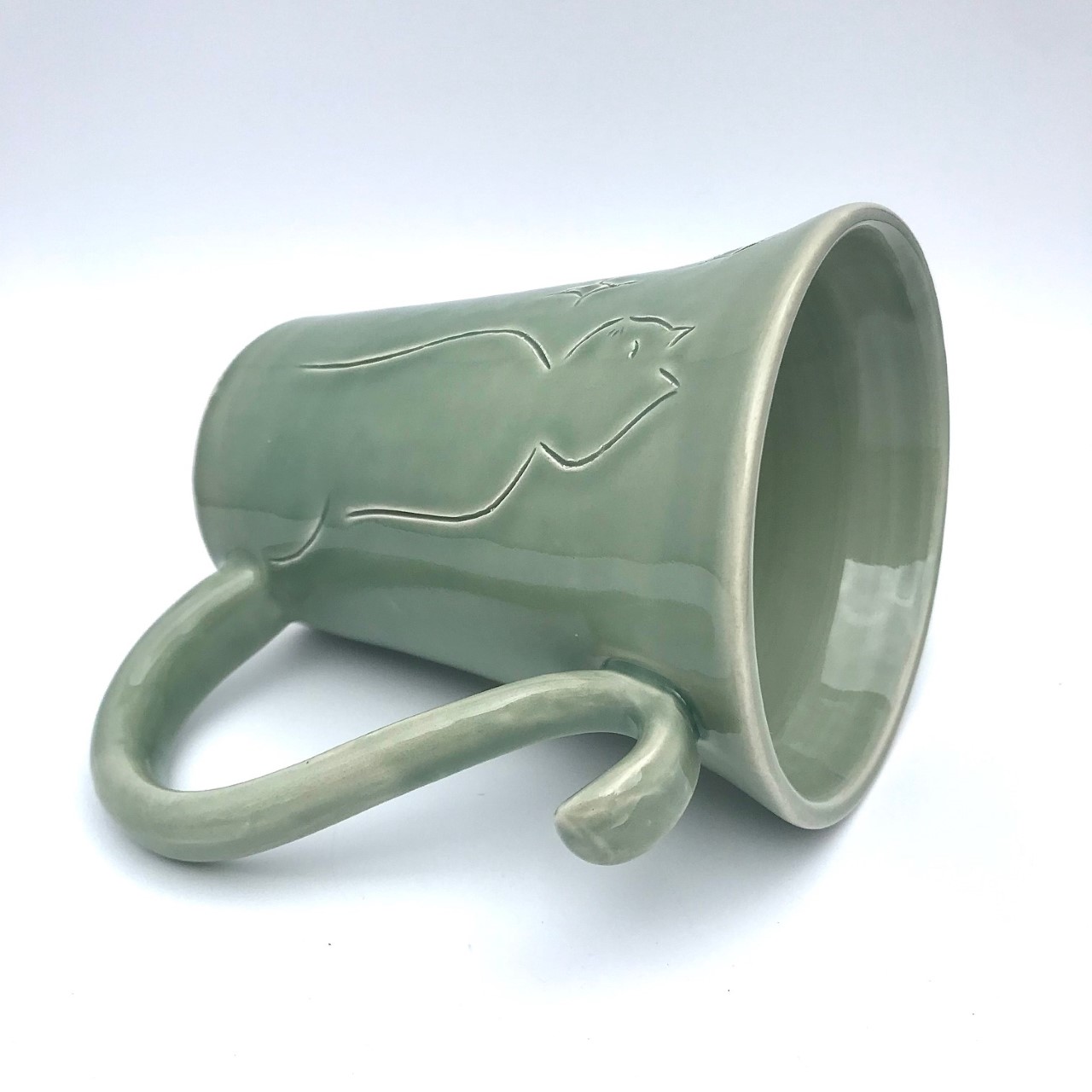 Je vous propose ici un mug en faïence émaillée couleur céladon décoré d’un chat.