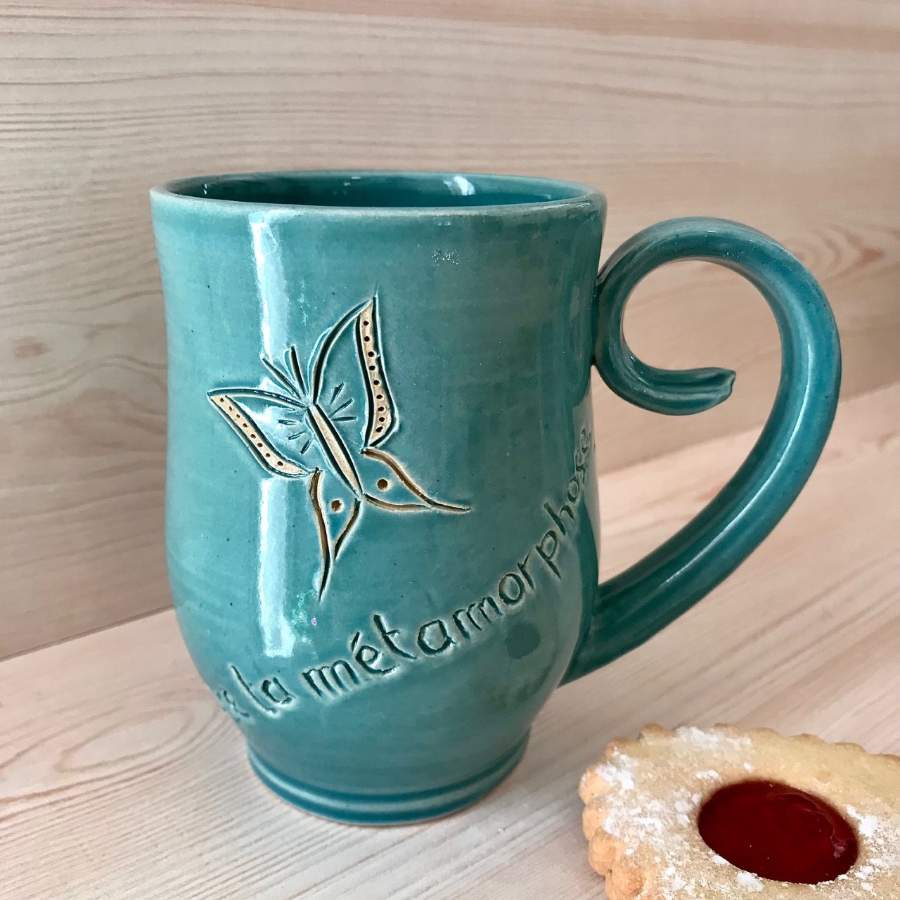 Je vous propose ici un mug en grès émaillé couleur vert/bleu, porteur du message : « Ose ta métamorphose »
