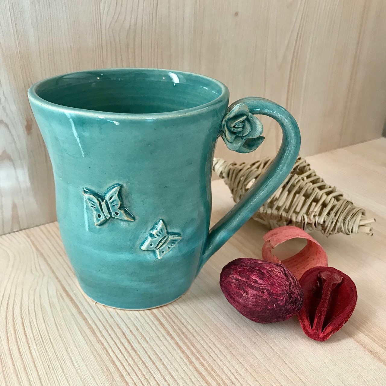 Je vous propose ici un mug en grès émaillée couleur vert Amazonie orné de deux papillons en pleine danse de la séduction et d’une fleur en relief.