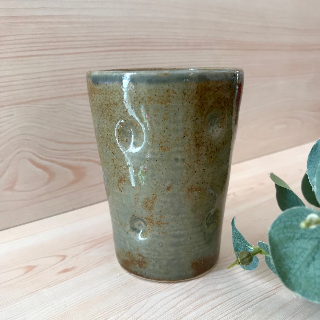 Je vous propose ici un mug/verre en grès émaillé couleur marron bleuté, paré de cœurs en relief.
