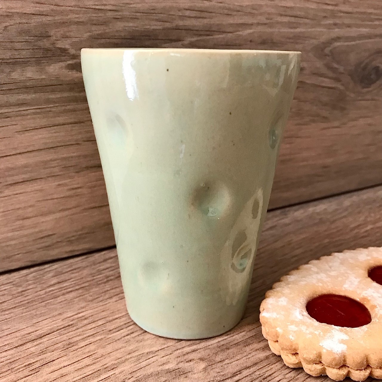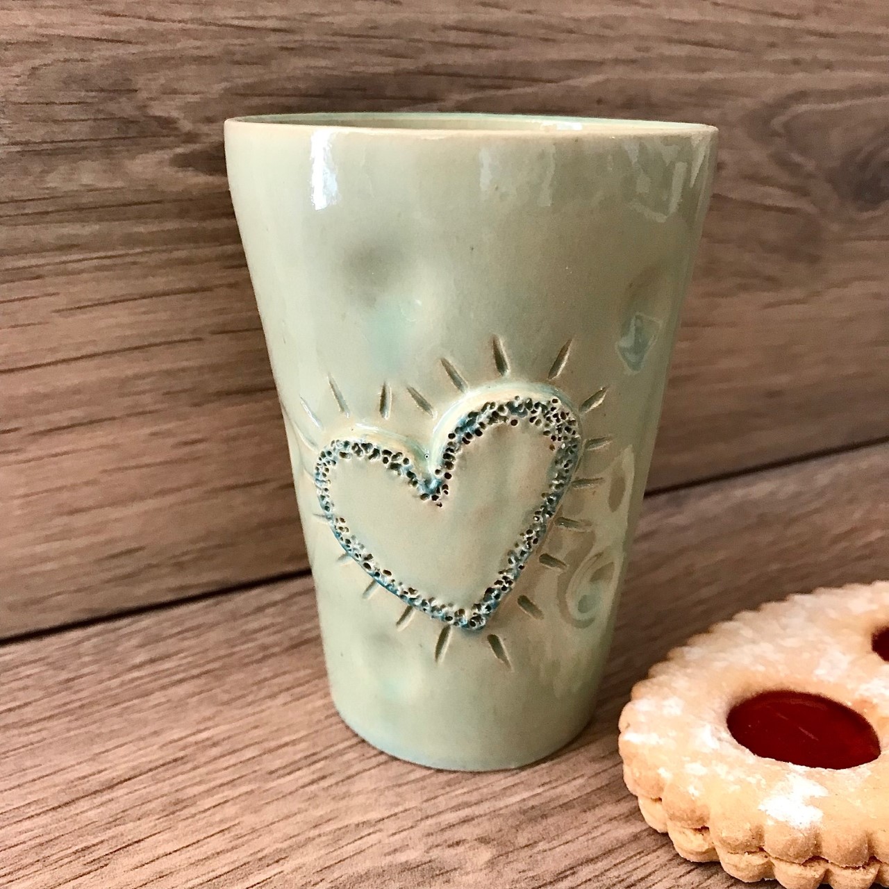 Je vous propose ici un mug/verre en grès émaillé couleur céladon, paré de cœurs en relief.