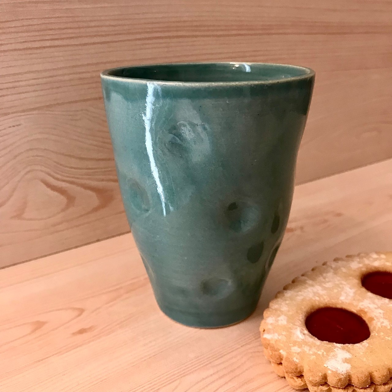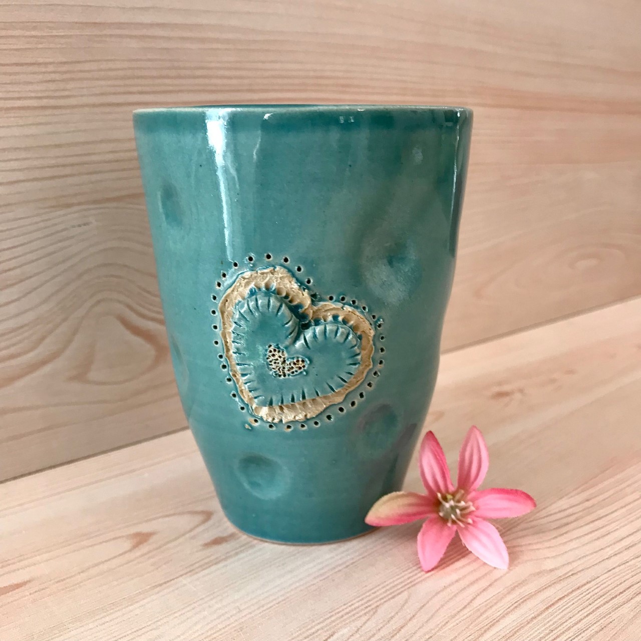 Je vous propose ici un mug/verre en grès émaillé couleur vert Amazonie, paré de cœurs en relief.