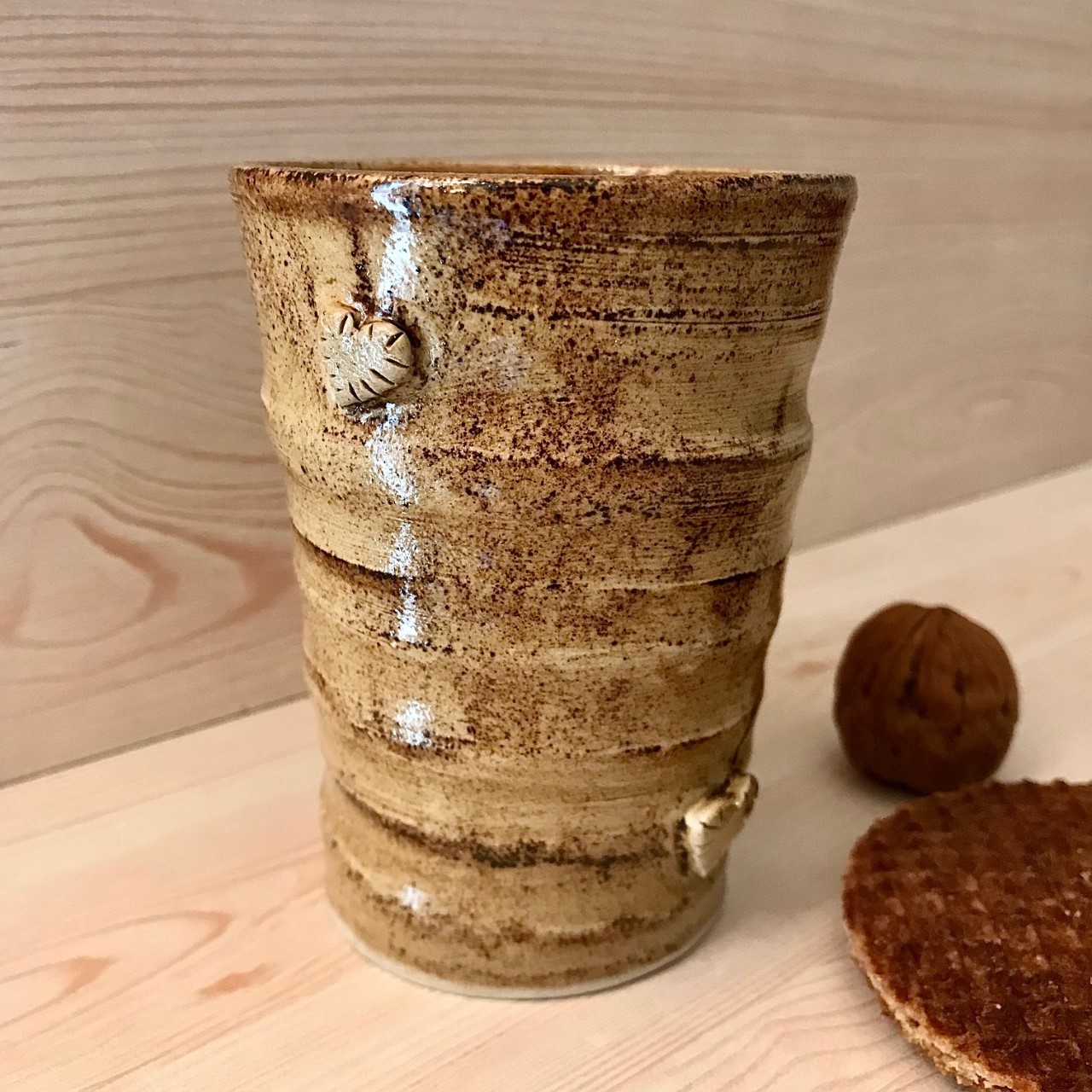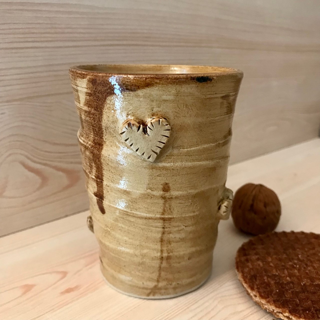 Je vous propose ici un mug/verre en grès émaillé couleur chocolat, paré de cœurs en relief.